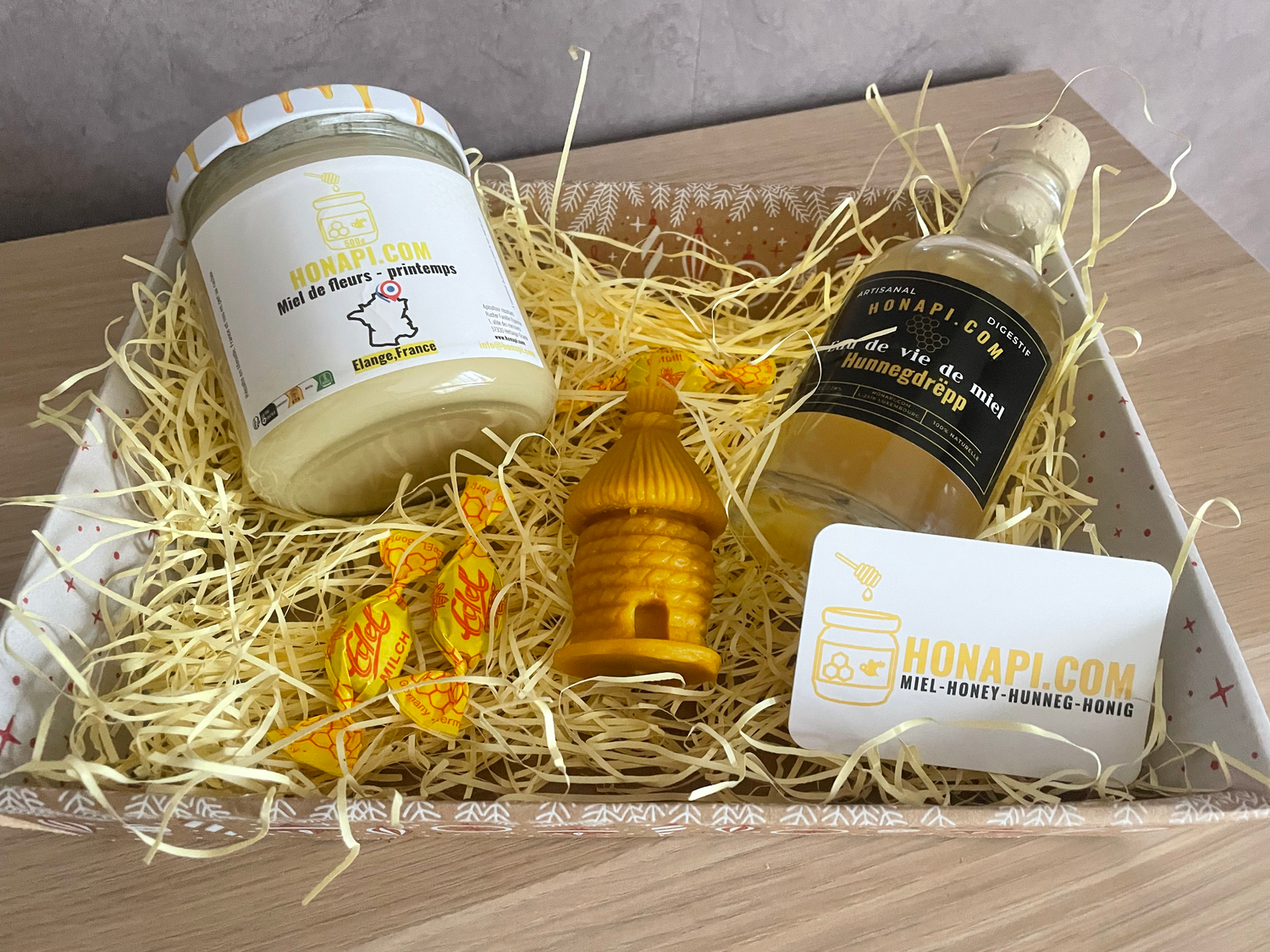 Coffret cadeau personnalisable avec miel, eau de vie et bougie artisanale. Gourmand ou découverte pour faire découvrir les produits locaux issus de la ruche